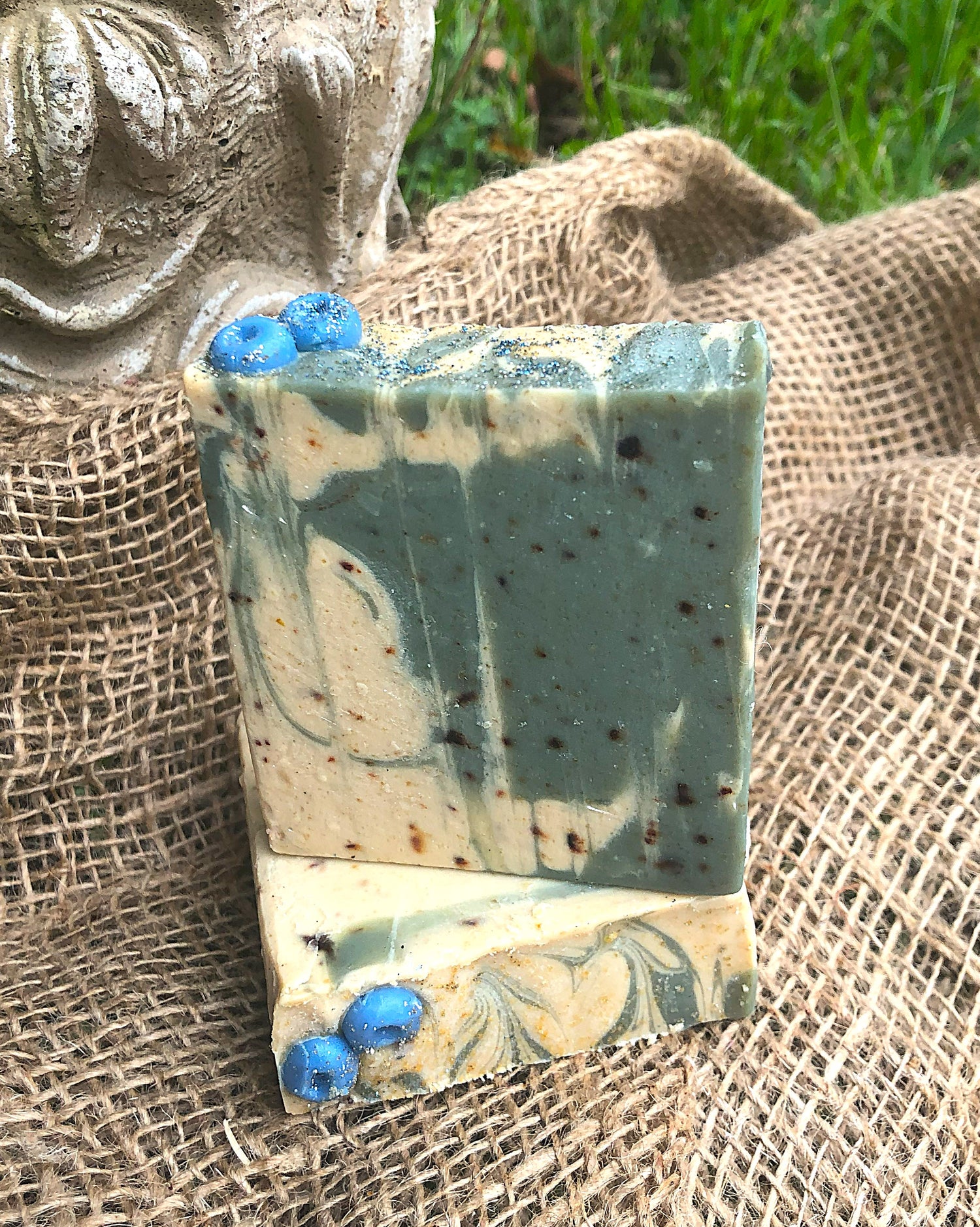 Made with fresh blueberries and local goat's milk, you're sure to love this soap! The blueberries provide a slight exfoliation while the goat's milk, shea butter, and cocoa butter act as natural moisturizers for your skin. With notes of blueberries, bergamot, lemon, and thyme, you will love this sweet and savory scented soap! $6