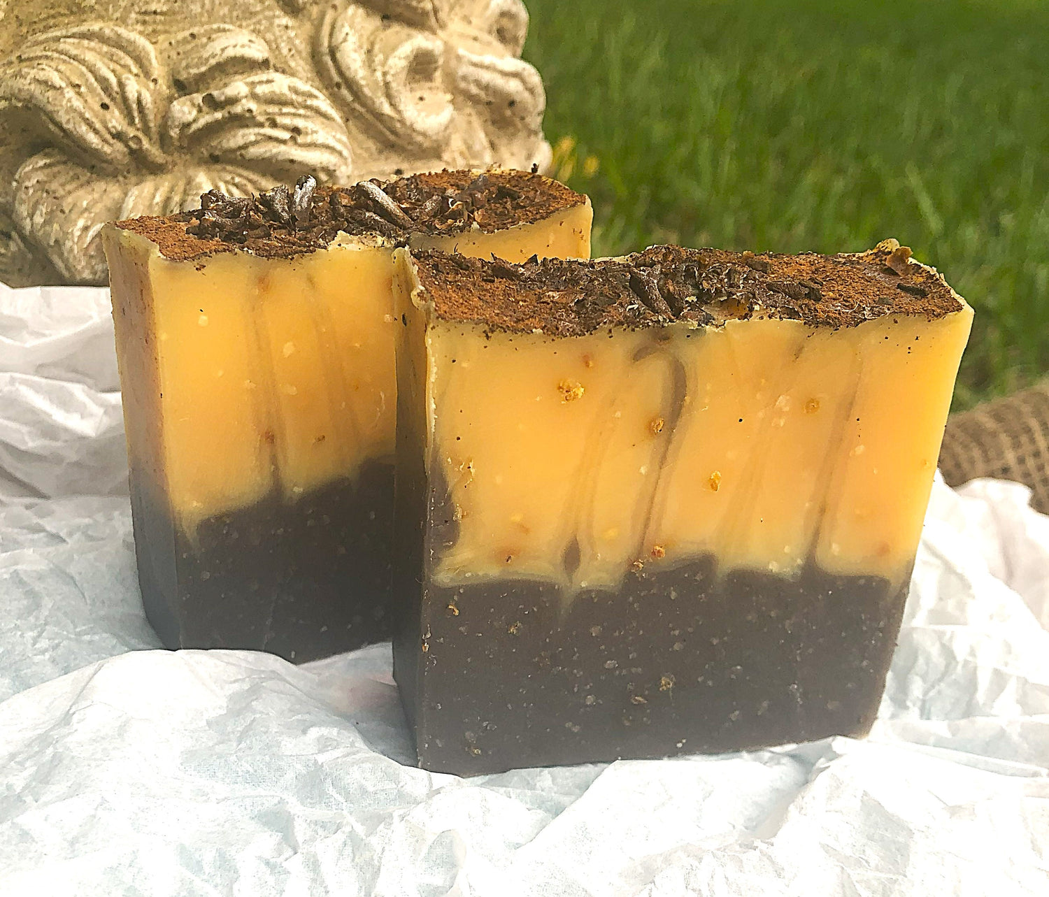 Ingredients: Olive Oil, Coconut Oil, Water, Sodium Hydroxide, Castor Oil, Shea Butter, Cocoa Butter, Sweet Almond Oil, Fragrance, Sodium Lactate, Dried Orange Peel, Micas, Cinnamon, Whole Cloves.